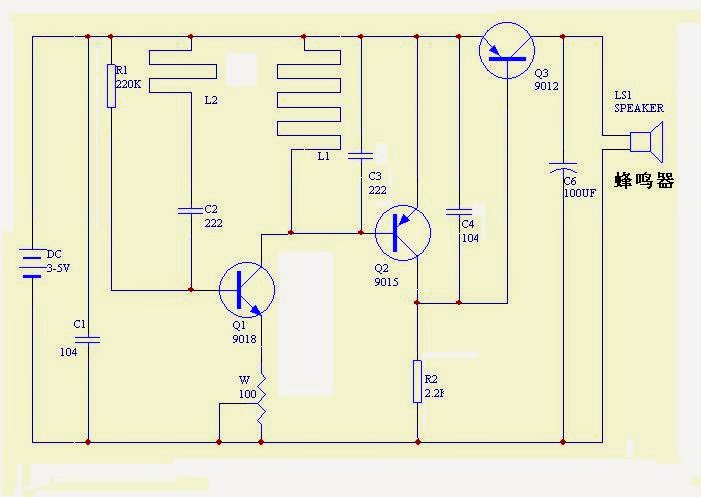 當探測線圈L1靠近金屬物體時,會在金屬導體中產生渦電流,使振盪回路中的能量損耗增大,正回饋減弱,處於臨界態的振盪器振盪減弱,甚至無法維持振盪所需的最低能量而停振,使Q2截止,R2給C4充電,Q3導通,推動蜂鳴器發聲。